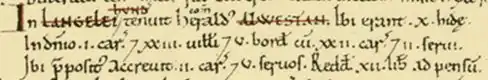 The Domesday Book of 1086 recorded the following entry for Alveston: In Langelei Hundredum tenuit comes Herald Alwestan ibi erant X hidae in dominio, I carruca, XXIII villi, V bordarii cui XXII carrucae, II servii. Ibi ppos..accrevc.. II carucae, V servos. Reddat XII libri ad pensu. Translated as follows: "In Langeley Hundred Earl Harold held Alveston. There were there 10 hides in demesne, 1 plough-team, 23 villeins, 5 bordars for whom there were 22 plough-teams, 2 serfs. There....2 plough-teams, 5 serfs. It returned £12...." This was a very large manor, of 35 households in total.[5] As the manor had been held by King Harold Godwinson it was seized into the royal demesne by William the Conqueror and remained in use as a royal hunting park until 1149.
