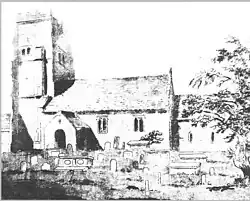 Alveston Old Church of St Helen's, next to Alveston Manor (now called "Old Church Farm"), Rudgeway. The church is now ruined, with only the tower and south wall of the nave remaining