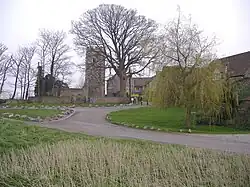 The ruins of Alveston Old Church of St Helens is situated in Rudgeway, south of the modern village of Alveston, along the A38. The separate parish of Alveston was not formed until 1846, before which time Alveston manor was within the parish of Olveston. Following the development and growth of the modern village of Alveston some distance away from the manor house and the Church of St. Helen next door to it, it was determined by the village authorities to build a new church, again dedicated to St Helen, nearer to the new village. The old church fell into disuse and decay, and today only the tower and south aisle wall remain standing, although the structure has been restored to a high standard by the aerospace company Rolls-Royce plc, the owner of both the former manor house, now used for corporate hospitality and known as "Old Church Farm", and the church itself.