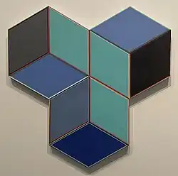 In the 1960s, Loving grew increasingly interested in Josef Albers's paintings of squares within squares.[6] In an interview, he explained: "For me at the time, it was about painting the square until it was 'enough,' and that meant until it obtained form. The square that I started with would always be gone; only I knew it was a square, that that reference was there. That freed me to just paint and let things evolve...[The square] was pure energy and focus.”[7] These geometric abstractions conveyed the brilliance of refracted light; they were not just experiments in color. Loving would often make polyhedrons of the same size, with different colors, and hang them together in different arrangements on the wall. The result was sometimes dozens of canvases stretching out over several feet; to view an entire composition would take time, more than just a glance, making his paintings a powerful expression of time, too.[8] Loving's geometric paintings were featured in his first solo exhibition at the Whitney Museum of American Art.[3] Loving later abandoned hard-edged abstraction painting.[3]
