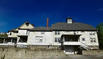 The Alvin O. Lombard House is in downtown Waterville, on the east side of Elm Street just south of the public library, in an increasingly commercial area. It is a rambling 2+1⁄2-story wood-frame structure, with a gambrel roof, shingled exterior, and stone foundation. Its front facade, facing west, is dominated by a projecting gabled section, which features a recessed porch flanked by polygonal windows bays, and a three-window recess in the upper part of the gable. A single-story porch extends across the front, and sweeps around to the side without a covering roof. A two-story carriage house of similar styling is attached to the northeastern corner; it has a square cupola at the top of its gambrel roof. The interior retains significant original decorative elements, despite its 1940s alteration into a multiunit residence.[2]