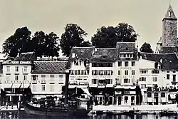 - ^ Gossauer's claimed "1879" (in fact 1878) photography was supplemented with graphic elements: ships, waves and grass in the foreground, as wells as the causeway with steam railway, carriages and pedestrians added. First published in "Geschichte der Stadt Rapperswil", the photograph was predated because the railway causeway was still under construction in 1878.