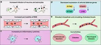 Studies have shown a degree of overlap between genetic risk factors for AD and severity of COVID-19. The primary genetic risk factor for late onset AD is the presence of the Apolipoprotein E (APOE) 4 allele.[9] APOE is a protein that is responsible for transporting cholesterol and other lipids between cells.[9] It is present in the brain, where it is secreted by resident immune cells, as well as in the cardiovascular system.[9][8] Patients carrying the APOE4 gene variant are at a higher risk of developing AD due to impaired clearance of Aβ from the brain.[9] Approximately 14.8% of AD patients carry two copies of the APOE4 allele, in comparison to 1.9% of the general population.[9] In addition to its role in AD, APOE4 carriers are also at an increased risk of developing severe COVID-19 and dying due to the disease.[5] Aside from its role in Aβ clearance, APOE4 increases the risk of cardiovascular disease, which is associated with mortality and morbidity due to SARS-CoV-2 infection.[5] Furthermore, APOE4 carriers may show a decreased ability to express key genes involved in the antiviral response, which may compromise the ability to fight the virus in AD patients carrying the allele.[7] Additionally, APOE4 carriers show increased secretion of pro-inflammatory cytokines in response to viral stimulation and show increased BBB permeability, respectively increasing the risk of severe disease and neuroinvasion.[7] In induced pluripotent stem cell (iPSC)-derived neurons, APOE4 genotype has been shown to increase the rate of SARS-CoV-2 Infection.[7]