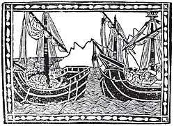 Woodcut depicting Vespucci's first voyage to the New World, from the first known published edition of his 1504 letter to Piero Soderini