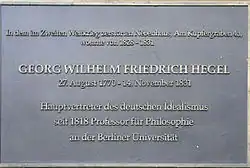 Georg Wilhelm Friedrich Hegel lived from 1819 to 1831 in the war-damaged house Am Kupfergraben 4a. A plaque commemorating Hegel is attached to the neighbouring house, Am Kupfergraben 5. By mistake, the number 5 is often mistaken for Hegel's house. This was the residence of the "Institute for Foreigners" of the Berlin University, which existed until 1945. In the GDR, the Institute for Musicology (Institut für Musikwissenschaft) of the Humboldt University of Berlin moved into the building. After a thorough renovation, the Department of Musicology (Seminar für Musikwissenschaft) has been located in number 5 again since 2003. In the years 1825/1826 the mathematician Niels Henrik Abel also lived in the house Am Kupfergraben 4a, where he spent a research-intensive period. In memory of Abel, a plaque has been attached to the new building which has been erected in the meantime since 2014.[11]