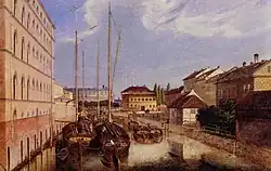 A first development Am Kupfergraben was already carried out around 1580, as a contemporary depiction shows: The Kupfergraben was called Ludwigsgraben for a while after its former owner, the Privy Councillor of State. The artillery barracks, completed in 1773 [No. 1-3], occupy the largest part of the street. Opposite the barracks on the Graben is the royal gunsmith's shop [No. 8]. (Ernst Fidicin)[2]