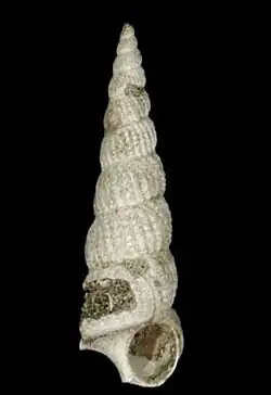 A shell significantly smaller than the typical † Clathroscala cancellata, elongated and tapering to a fine point, smooth (except for the growth lines), thin and fragile. It features 9 or 10 slightly convex whorls, adorned with fine, closely packed, longitudinal ribs and delicate transverse striations, both of which terminate abruptly at the peristome. The suture is deep. The aperture is subcircular, and the peristome is continuous. [2]