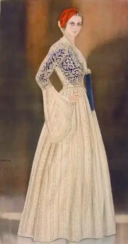 When she arrived in Greece as a queen in 1837, she had an immediate impact on social life and fashion. She realised that her attire ought to emulate that of her new people, and so she created a romantic folksy court dress, which became a national Greek costume still known as the Amalía dress.[7]