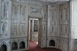 In the south of the hall, the door leads to the electoral Rest Room and the Blue Cabinet, with access to the privy chamber. The Rest Room was the bedroom of the Electress, and the pavilion also accommodates an armoury and a kennel room for the hunting dogs in the Blue Cabinet.[1]