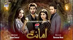Amanat (meaning trust or fidelity in Urdu) is a 2021 Pakistani television series produced by Samina Humayun Saeed and Sana Shahnawaz under banner of Next Level Entertainment in collaboration with Six Sigma Plus. It features Imran Abbas, Urwa Hocane, Saboor Aly in lead roles and Haroon Shahid, Srha Asghar and Gohar Rasheed in supporting roles. It airs weekly on ARY Digital starting from its premier on 21 September 2021.[1][2][3]