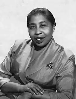 Randolph worked on the vaudeville and burlesque circuits as a comedian[21] and as a singer, noting that Abbott and Costello also got their start the same way.[6][22][23] Randolph took a four-year hiatus from show business in 1932; she married and helped her husband run their restaurant in New York called The Clam House, which was a favorite of those in the entertainment industry.[18][24] She then returned to performing, playing piano at a Greenwich Village club called The Black Cat.[25][26] She continued recording for Bluebird Records, a label created in 1932 and owned by RCA Victor Records. She did the vocals with her own band, billed as Amanda Randolph and her Orchestra.[27][28] The records were made in New York City on October 8, 1936. On that date, Amanda cut: "Please Don't Talk About My Man" (Bluebird 6615), "Doin' The Suzie-Q" (Bluebird 6615), "Honey, Please Don't Turn Your Back On Me" (Bluebird 6616), "For Sentimental Reasons" (Bluebird 6617), "He May Be Your Man But" (Bluebird 6617), and "I've Got Something In My Eye", (Bluebird 6619-B).[27][28][29] She also recorded "After Hours"; some of these songs can be heard on radio station KBRD which also broadcasts on the internet.[30]