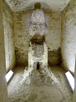 The inner hall leads to the back of the tomb, where the shrine area is located. The uppermost segment of the lintel of the shrine's doorway is decorated with a carving of the uraeus.[5] The lower portion shows unfinished carvings of a line of djed-pillars.[10] The shrine houses an unfinished and disfigured limestone statue of Ahmose. In this statue-niche, the figure of Ahmose is seated, a characteristic pose of Egyptian burial sculpture which symbolises a willingness to receive offerings.[11] The empty recesses of the stone statue once consisted of coloured decorative elements carved out of faience.[10] A shallow libation bowl is carved in the floor at the foot of the statue, used for religious offerings to the gods.[5] The shrine area was closed off by wooden folding doors. The side wall of the statue-niche was cut in a perfect square, demonstrating expertise in stonemasonry.[5] Throughout the tomb, the undecorated walls are mostly covered in Greek graffiti, which was scratched into the plaster.