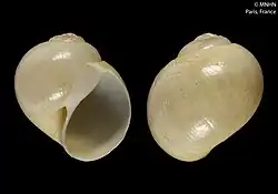 (Original description in French) The shell is fairly small, with a very globular shape and a diameter where the body whorl is highly developed, accounting for 7/9 of the total height. The lateral profile on the side opposite the outer lip is well-rounded, then tapers fairly quickly towards the base.