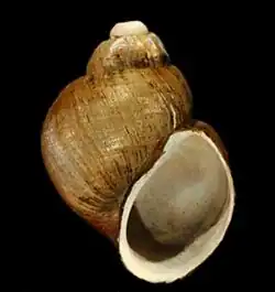 The aperture exceeds half the length of the shell and is ovate in shape. The outer lip is thin, while the columella is white, thickened, and smoothly rounded. A thin callus lines the inner lip. The umbilicus is either closed or reduced to a mere chink. The spire is very short and bluntly rounded.
