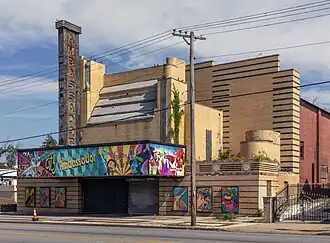 The Ambassador Theater is a large two-story brick auditorium with a ziggurat-like stepped facade organized around two vertical pylons. The Liberty Heights Avenue frontage is built of yellow brick, accented with contrasting horizontal brick striping. The western pylon holds the theater's sign. The theater is in the Streamline Moderne style, with prominent curves. The rounded forms and steps were originally emphasized by neon tubing. The theater's marquee extends the entire width of the front. A deep recess at the center forms the theater's entrance. Much of the lower facade originally incorporated Vitrolite panels, which has since been removed. The side and rear elevations are plain and utilitarian, in red brick.[4]