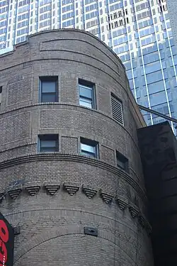 A molding with corbels forms a fake cornice above the third floor.[9][11] The fourth floor contains windows within brick openings. There is a parapet above the fourth floor, which wraps around the eastern corner. The western facade is plain brick with a fire escape.[9]