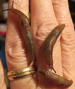 - ^ a b Vendetti, J.E.; Burnett, E.; Carlton, L.; Curran, A.T.; Lee, C.; Matsumoto, R.; Mc Donnell, R.; Reich, I.; Willadsen, O. (11 July 2019). "The introduced terrestrial slugs Ambigolimax nyctelius (Bourguignat, 1861) and Ambigolimax valentianus (Férussac, 1821) (Gastropoda: Limacidae) in California, with a discussion of taxonomy, systematics, and discovery by citizen science". Journal of Natural History. 53 (25–26): 1607–1632. doi:10.1080/00222933.2018.1536230. S2CID 92483299.