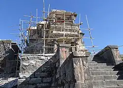 The early temple was built before 784 CE (probably in middle of the 8th century) because Digambara Acharya Jinasen's Harivamsapurana (Saka Samvat 705, 783 CE) mentions the temple.[1] An inscription dated Vikram Samvat 1249 (1192 CE) mentions Vaghela minister Vastupala's pilgrimage to Ambika temple on Raivataka (Girnar) hill. Narendraprabhsuri mentions that Vastupala had installed idols of himself and his brother Tejapala in the temple. Jinharshasuri mentions that Vastupala and his brother Tejapala visited as well as built the large mandapa of the temple and parikara of Ambika.[2][1] A praśasti eulogy given at the end in a golden lettered copy of Kalpasutra dated Vikram Samvat 1524 (1468 CE) mentions that a Shreshthi (merchant) named Samal Sah restored and renovated the Ambika temple on Girnar.[2][3][1] As mentioned in Jain pilgrimage travelogues, the temple had Ambika as a Jain yakshika deity. The Girnar patta from Samvat 1507 in Ranakpur Jain temple also depicts Ambika in the similar manner. The temple is built according to the Jain tradition and the mandapa ceiling match with the Girnar Jain temples. According to M. A. Dhaky, the temple came under a control of the Brahminical tradition in the late medieval period. The original idol was lost during the subsequent attacks and currently a falahi is venerated in the temple.[1]