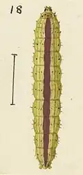 He again discussed the larva of this species in 1950 and also illustrated the larva as well as the pupa of this species.[10] Hudson described the specimen upon which he based his 1950 saying that the green subdorsal lines he described in 1939 were replaced by faint, broken reddish coloured lines. Hudson also stated that the larva of A. facatalis had black legs which appeared to be characteristic for this species.[10]