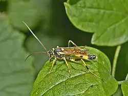 Amblyteles armatorius can reach a length of 12–16 mm, excluding antennae, which reach about 9 millimetres (0.35 in). The head and thorax of this large wasp are black, except the yellow scutellum. The abdomen is yellow and more oval in the females, with broad black bands. Legs are yellow, except the hind legs, that are black and yellow. This species lacks a sting, so the characteristic markings of many aculeate wasps represent a protective mimicry.[8] [9] The female has a very short ovipositor that doesn't protrude from the abdomen.[7]