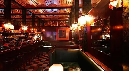The bar's interior is notable for its intricate materials that make its 290 square foot layout feel more cozy than cramped. The bottom half of the wall is covered with mahogany, while the top half is encompassed by mirrors that continue the linear geometry of the room and creates a feeling of expansiveness.[3] Above the entry, sunlight from the street seeps in through tiles of onyx, which are mirrored by green and white marble tiles on the ground, and coffered marble ceilings. A mahogany bar with gold fixtures takes up the left side of the roof and three low green leather booths line the walls on the right.[3] There is a basement and cellar area, but little documentation exists on this area.[1]