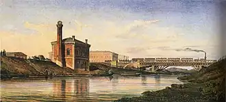 The William Howe's system was theoretically checked and then improved by the Russian engineer Dmitrii Juravsky, who was an executive assistant to George W. Whistler during the construction of the railway line. Juravsky performed structural analyses and tests on physical models of Howe trusses from 1843 to 1848, and executed studies of the effect of posttension in Howe trusses. He published two books "About Bridges of the Howe System" in 1855 and 1856.[1]