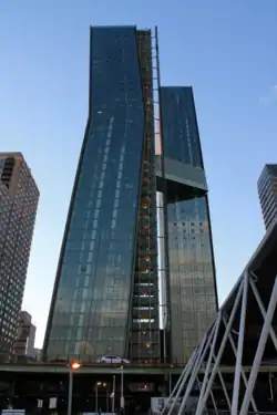 The north and south elevations of the building's facade are clad in copper, while the east and west elevations are floor to ceiling glass. The two towers are designed such that they appear to "dance" with each other.[2] They are connected by a bridge approximately 300 feet from the ground, three levels in height.[22] The west tower is 540 feet in height, and the east tower is 470 feet tall.[1]