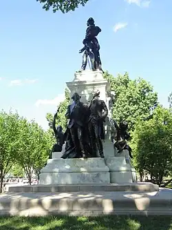 Clark Mills was commissioned to create an equestrian statue of George Washington, the country's first president and commander-in-chief of the Continental Army. The equestrian statue was installed in 1860 in Washington Circle, the first of the 14 American Revolutionary statuary to be erected in Washington, D.C.[2] The next statue of a Revolutionary War hero was in honor of Major General Nathanael Greene, erected in 1878 in Stanton Park and designed by Henry Kirke Brown.[4] It is considered one of the city's best equestrian statues.[5][6] The third statue, depicting Benjamin Franklin in a standing pose, was sculpted by Jacques Jouvenal and installed in 1889. It was later moved to its current location in front of the Old Post Office.[7] Franklin's statue is one of four of the statues not paid for by the U.S. government. It was a donation from Stilson Hutchins, founder of The Washington Post.[7] The fourth statue installed, sculpted by Alexandre Falguière and Antonin Mercié, was in honor of Major General Gilbert du Motier, Marquis de Lafayette, one of two French military figures to be honored in Lafayette Square. It was erected in 1891.[8] The park had been named after him during his 1824 visit to the U.S.[5]