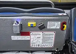 The bottom of an American Seating-built bus seat, flipped up to accommodate a handicapped passenger.