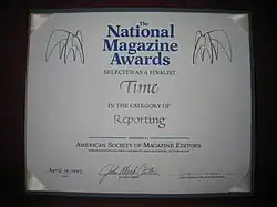 Time magazine's ASME finalist certificate, issued in April 1992 | |