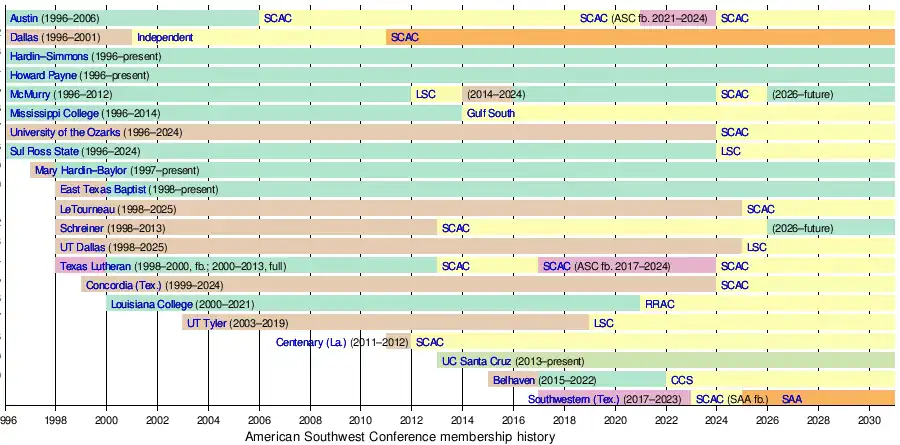 - ^ Austin College was a full member of the ASC from 1995–96 to 2005–06 before leaving to join the Southern Collegiate Athletic Conference (SCAC).