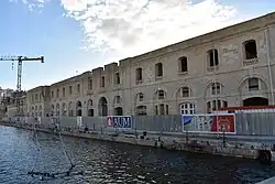 The British Building was built between 1841 and 1844 as a workshop within Dock no. 1, which was being constructed for the British Royal Navy.[34] Its architect was William Scamp, who also designed the rest of the dockyard, and some alterations were carried out in the late 19th and early 20th centuries.[35] The building was damaged by aerial bombardment during World War II,[34] and repairs and alterations made after the war were unsympathetic to the building's aesthetics. An almost identical building which was located on the opposite side of the dry dock was demolished between 1972 and 1974. This is regarded as destruction of cultural heritage,[35] but it led to the creation of an open space which was rehabilitated and opened to the public in 2014.[36]