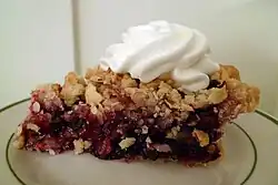 Blueberry pie recipes are known from the mid-19th century, which is later than for other fruits like apple pie. One recipe from 1850 is made with just flour-dredged blueberries and sugar baked in pastry.[31] Wild blueberry pie has been the official state dessert of Maine since 2011.[32]