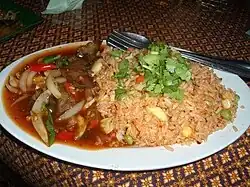 American fried rice (Thai: ข้าวผัดอเมริกัน, RTGS: khao phat amerikan, pronounced [kʰâ(ː)w pʰàt ʔāmēːrīkān]) is a Thai fried rice dish with "American" side ingredients like fried chicken, ham, sausages, raisins, and ketchup.[1] Other ingredients like pineapples and croutons are optional.
