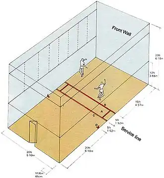 American handball is played on a walled court, with either a single (front) wall, three walls, or in a fully enclosed four-wall court; four-wall courts typically have a ceiling while three-wall courts may or may not. The four-wall court is a rectangular box. The front wall is 20 feet (6.1 m) square, and the side walls are 40 feet (12.2 m) long and 20 feet (6.1 m) high.