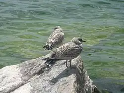 Adult European herring gulls are very similar to American herring gulls but those of the subspecies L. a. argenteus are smaller than many American birds[10] while those of the northern subspecies L. a. argentatus are typically darker gray above. European birds lack the long gray tongues on the 6th, 7th, and 8th primaries and solid black markings on the 5th and 6th primaries that are shown by American herring gulls.[14] First-winter European birds have more checkered upperparts, more streaked underparts, and a paler rump and base to the tail.[8]
