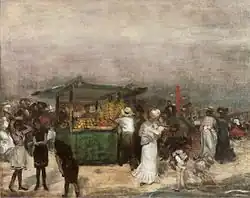 Robert Henri (1865–1921) was an important American Realist and a member of The Ashcan school. Henri was interested in the spectacle of common life. He focused on individuals, strangers, quickly passing in the streets in towns and cities. His was a sympathetic rather than a comic portrayal of people, often using a dark background to add to the warmth of the person depicted. Henri's works were characterized by vigorous brushstrokes and bold impasto which stressed the materiality of the paint. Henri influenced Glackens, Luks, Shinn and Sloan.[2] In 1906, he was elected to the National Academy of Design, but when painters in his circle were rejected for the academy's 1907 exhibition, he accused fellow jurors of bias and walked off the jury, resolving to organize a show of his own. He later referred to the academy as "a cemetery of art".