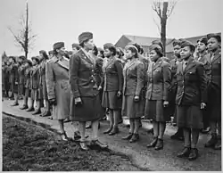 The Army established the Women's Army Auxiliary Corps (WAAC) in 1942, a noteworthy year because WAACs served overseas in North Africa, and because Charity Adams Earley also became the WAAC's first African-American female commissioned officer that year.[29] The organization never accomplished its goal of making available to "the national defense the knowledge, skill, and special training of the women of the nation";[30] however, as a result, the WAAC was converted to the Women's Army Corps (WAC) in 1943. Recognized as an official part of the regular army, more than 150,000 women served as WACs during the war with thousands were sent to the European and Pacific theaters. In 1944, WACs landed in Normandy after D-Day and served in Australia, New Guinea, and the Philippines in the Pacific. In 1945, the 6888th Central Postal Directory Battalion (the only all African-American, all-female battalion during World War II) worked in England and France, making them the first black female battalion to travel overseas. Commanded by Major Early, the battalion was composed of 30 officers and 800 enlisted women.[31][32] At the time, African-American recruitment was limited to 10 percent for the WAAC/WAC—matching the demographics of the U.S. population with a total of 6,520 African-American women enrolled for duty. Enlisted basic training was segregated for living, dining, and training, but while living quarters remained segregated at officer training and specialist schools, dining and training facilities there were integrated.[32]