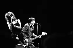 On January 20, 1965, the Byrds entered Columbia Studios in Hollywood to record Bob Dylan's acoustic tune "Mr. Tambourine Man" for release as their debut single on Columbia. The full, electric rock band treatment that the Byrds and producer Terry Melcher had given the song effectively created the template for the musical subgenre of folk rock.[9][10] McGuinn's melodic, jangling 12-string Rickenbacker guitar playing—which was heavily compressed to produce an extremely bright and sustained tone—was immediately influential and has remained so to the present day. The single also featured another major characteristic of the band's sound: their clear harmony singing, which usually featured McGuinn and Clark in unison, with Crosby providing the high harmony.[11] Additionally, Richie Unterberger has stated that the song's abstract lyrics took rock and pop songwriting to new heights; never before had such intellectual and literary wordplay been combined with rock instrumentation by a popular music group.[12]