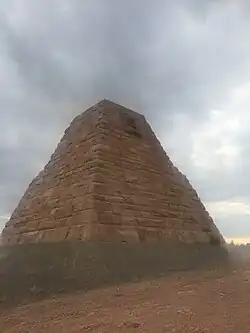 The Ames Monument is located about 20 miles (32 km) east of Laramie, Wyoming, on a wind-blown, treeless summit south of Interstate 80 at the Vedauwoo exit. The monument is a four-sided, random ashlar pyramid, 60 feet (18 m) square at the base and 60 feet (18 m) high, constructed of light-colored native granite. The pyramid features an interior passage, now sealed, alongside the perimeter of the structure's base.[6]