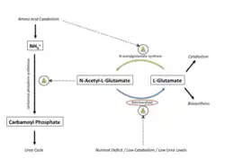 Aminoacylase is involved in the regulation of the urea cycle. N-acetyl-L-glutamate is an allosteric activator of carbamoyl phosphate synthetase, a crucial enzyme that commits NH4+ molecules to the urea cycle.[7] The urea cycle gets rid of excess ammonia (NH4+) in the body, a process that must be up-regulated during times of increased protein catabolism, as amino acid breakdown produces large amounts of NH4+.[7] When amino acid catabolism increases, N-Acetylglutamate synthase is up-regulated, producing more N-acetyl-L-glutamate, which up-regulates carbamoyl phosphate synthetase and allows it to dispose of the excess NH4+ from catabolism.[7]