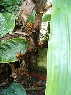 The name is derived from the Ancient Greek words αμισχος, meaning 'unstalked', and τολυπη, meaning 'tangle'.[1] The genus is characterised by its rather compact inflorescences which are composed on two or more cincinni that pierce through the base of the leaf sheath, and also by its seeds that are embedded in red arils. Flowers are actinomorphic, and anthers release their pollen either through a pore at the tip or slits down the sides. They are typically encountered in forest understories. The genus Porandra, which consists of three Asian species, is considered by Robert Faden, a leading authority on the family, to be "doubtfully distinct" from Amischotolype,[4] and Plants of the World Online considers it a synonym.[2] Analysis of DNA sequences has shown that Amischotolype is most closely related to the genus Coleotrype, while these two are in turn most closely related to the genus Cyanotis plus its synonym Belosynapsis. These four genera form a clade that is found only in the Old World, while all of its immediate ancestors are present only in the New World.[5][7]