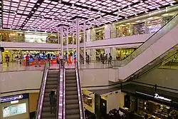 Amoy Gardens comprises 19 blocks, lettered A to S, with heights ranging from 30 to 40 floors.[1] The eight blocks A-H are 33 storeys/105 m high, and situated on a podium 14 m high, which houses a commercial centre. These eight blocks have eight flats per floor arranged in a cruciform shape. Each arm of the cruciform contains two apartments.[2] There is a shopping arcade (Amoy Plaza) as well as a food square within the Amoy Gardens estate.