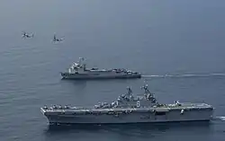 An amphibious transport dock, also called a landing platform dock (LPD),[1] is an amphibious warfare ship, a warship that embarks, transports, and lands elements of a landing force for expeditionary warfare missions.[2] Several navies currently operate this kind of ship. The ships are generally designed to transport troops into a war zone by sea, primarily using landing craft, although invariably they also have the capability to operate transport helicopters.