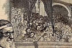 The Amphitheatrum Johnsonianum image is an exemplar of Nast's "crisp linear technique, sharp tonal contrasts and knack for monumental design."[32] Nast often used a multi-panel format that allowed him to present various scenarios, portraits, and tableaux side-by-side (and to integrate quotes from news accounts into the framework between the images), but "here...Nast uses only one picture."[33] The image, which has a strong overall visual cohesion, is nonetheless an assemblage of "striking and unmistakable" portraits.[8]