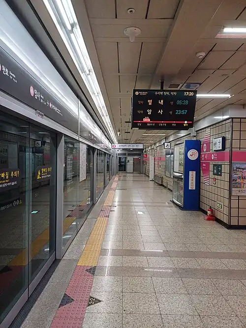 Amsa station (Korean: 암사; Hanja: 岩寺) is a subway station on Line 8 of the Seoul Metropolitan Subway. The station is located in the Amsa and Cheonho neighborhoods in Gangdong District, Seoul. The station used to be Northern terminus of the line and is approximately 31 minutes by train from Moran station. In August 2024, the line was extended to Byeollae.[2]