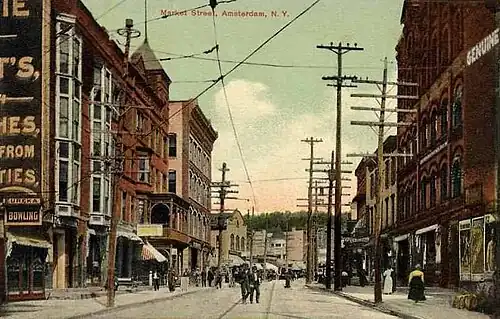 Amsterdam grew slowly after the war, primarily providing the services needed for the farming communities which surrounded it.[3] It was located in the now-defunct town of Caughnawaga.[4] When the Town of Amsterdam was created, the city changed its name to Amsterdam in 1803, possibly to encourage its selection as the seat of the town's government.[3]