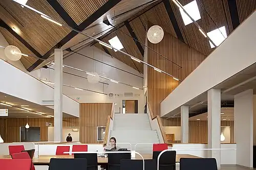 The AUC academic building, opened in 2012, was designed by Mecanoo architects. Its exterior appearance is dominated by a façade of rust-coloured steel plates. The interior design received praise in the media for its "open character".[16] The building won the 2013 Amsterdam Architecture Prize, for "the simplicity of its shape and its surprising interior. A variety of different types of space with a range of educational functions meet, connect and merge under one substantial roof, which is spectacular and yet unobtrusive."[17]