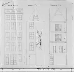 The relatively large sugar refinery "L'Union" was situated on the northern side of the Bloemgracht at number 148. It was auctioned in April 1841.[14] In April 1845 the equipment of this refinery was sold, perhaps due to Kooij acquiring the Schoonenburgh refinery in February 1844.[15] The house at Bloemgracht 150 was also part of this refinery. On 21 September 1849 one of the buildings of the sugar refinery "L'Union" on the Bloemgracht burned down. At the time B. Kooy Jz was the owner.[16] In November 1849 the house and the grounds of the burned down refinery were offered at an auction.[17] It did not become part of the public company Amsterdamsche Stoom Suikerraffinaderij in 1856.