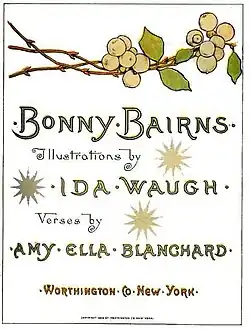 In 1888 she published her first book, and the first collaboration with Ida Waugh, Bonny Bairns, with the Worthington & Co. firm of New York.[3] In this book the usual order was reversed, and the pictures were illustrated with verses. The combination was not only pleasant but pretty. The lithographs were beautifully executed and did full justice to the drawings, which were of a much higher quality than usually appeared in children's picture books. The verses that accompanied them made a pleasant jingle with just sense enough to make them attractive to the chubby critic.[7]